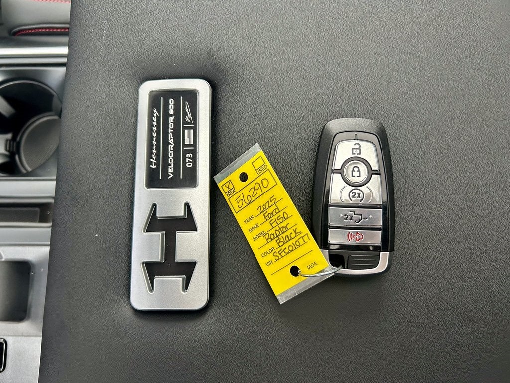 2025 Ford F-150 Raptor upgraded to Hennessey VelociRaptor 600 with ~600 HP, carbon fiber engine upgrades, Hennessey interior badging, and warranty.