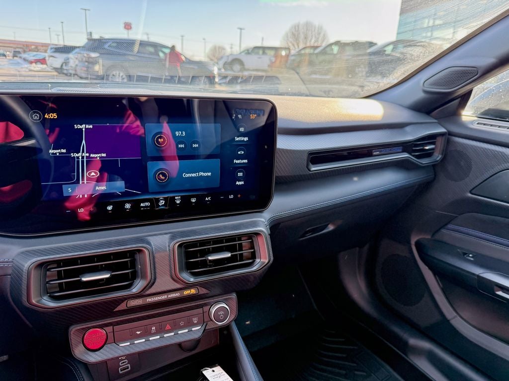 The track-focused Dark Horse trim outfits the Mustang with exclusive 19-inch forged aluminum wheels wrapped in performance tires, a functional aerodynamic package with a distinct front splitter and rear wing, and unique Dark Horse signature graphics. Inside, you'll find Miko suede and leather-trimmed sport seats with Dark Horse branding, a suede-wrapped steering wheel with an integrated shift light, and exposed carbon fiber interior accents. The driver-centric cockpit features a customizable 12.4-inch digital instrument cluster with unique track apps, dual-zone automatic climate control, and a premium B&O 12-speaker sound system engineered to complement the V8's roar.